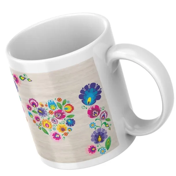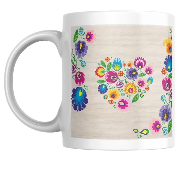 Wzór: Kolorowe kwiaty ludowe ułożone w kształt serca na jasnym tle – tradycyjny, żywy i pełen energii styl łowicki.✅ Pojemność: 330 ml – idealny na kawę, herbatę lub inny ulubiony napój.