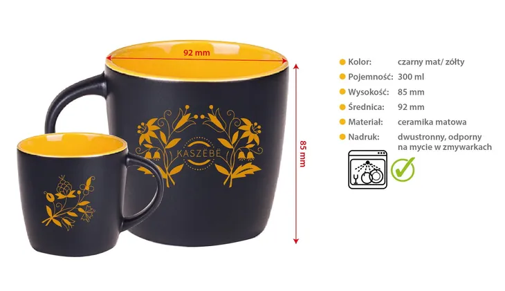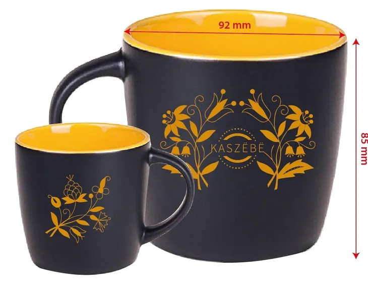 Ceramiczny, matowy, dwukolorowy czarno-żółty kubek z folk wzorami kaszubskimi i napisem Kaszëbë (tłum. Kaszuby). Nadruk dwustronny odporny na mycie w zmywarkach. Wnętrze kubka w kolorze żółtym. Cena dotyczy jednej sztuki. Czarno-żółte kolory są związane z flagą i godłem Kaszub - gryfem.